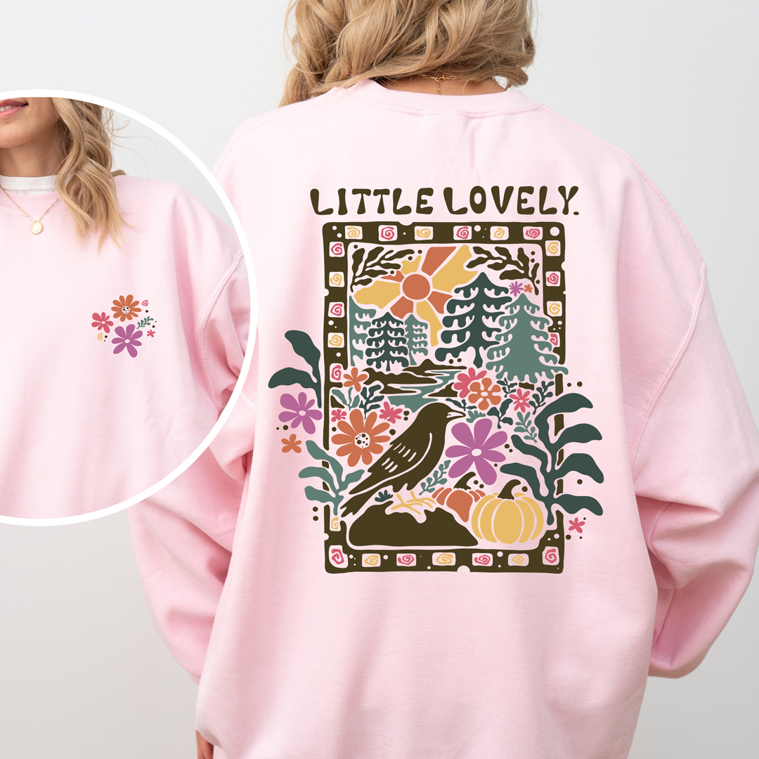 Step into a whimsical fall dream with this exclusive Little Lovely sweatshirt. This design brings together nature, flowers, sunshine, pumpkins, and a peaceful crow in a cozy forest scene. it’s the perfect cozy piece to celebrate autumn with a unique touch you won't find anywhere else.