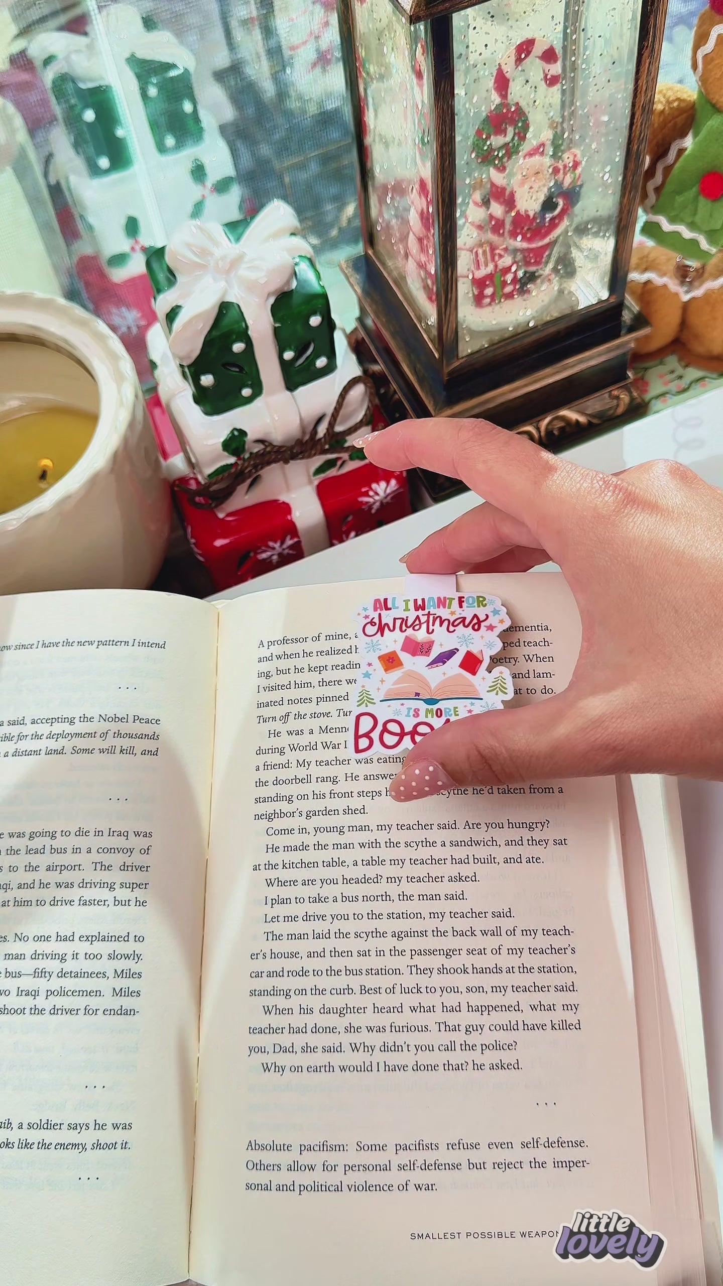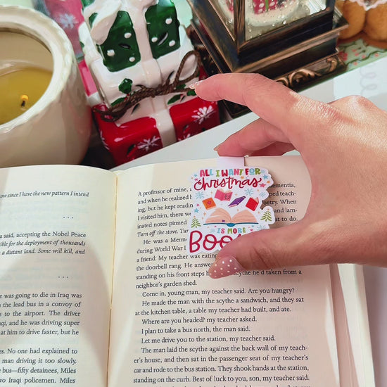 This festive magnetic bookmark features the quote “All I want for Christmas is more books” surrounded by snowflakes, gifts, and holiday sparkle. Perfect for any book lover’s TBR pile!