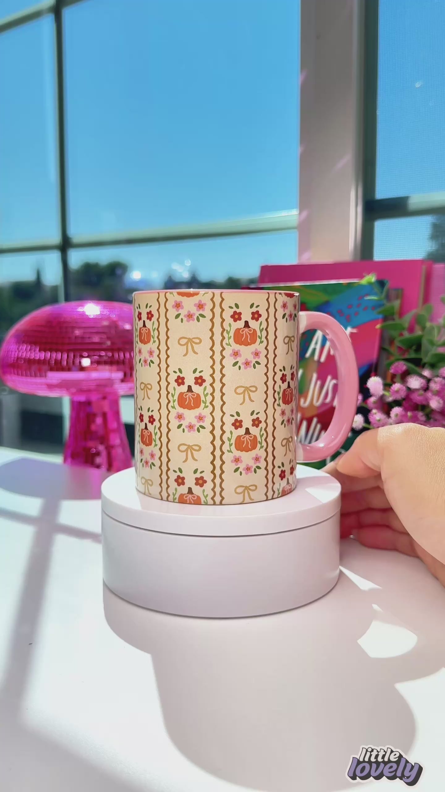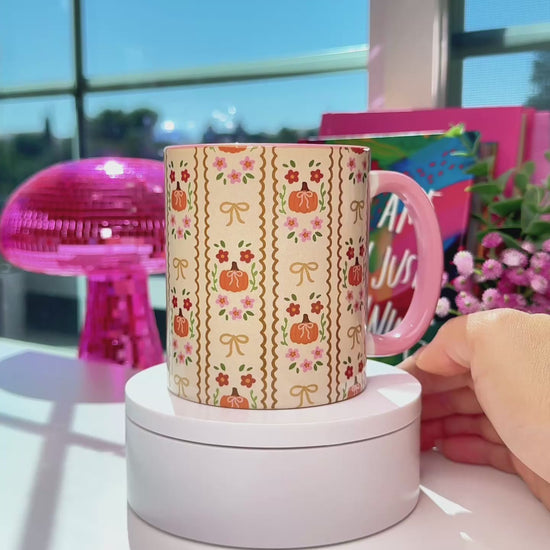 Add a touch of autumn coziness to your coffee or tea with this pumpkin and floral patterned mug. Featuring charming pumpkins, bows, and flowers in a repeating design, it’s the perfect cup for fall lovers and cozy mornings. Crafted from durable ceramic, this mug is both microwave and dishwasher safe, making it practical and adorable. A must-have seasonal mug for yourself or as a thoughtful fall gift.