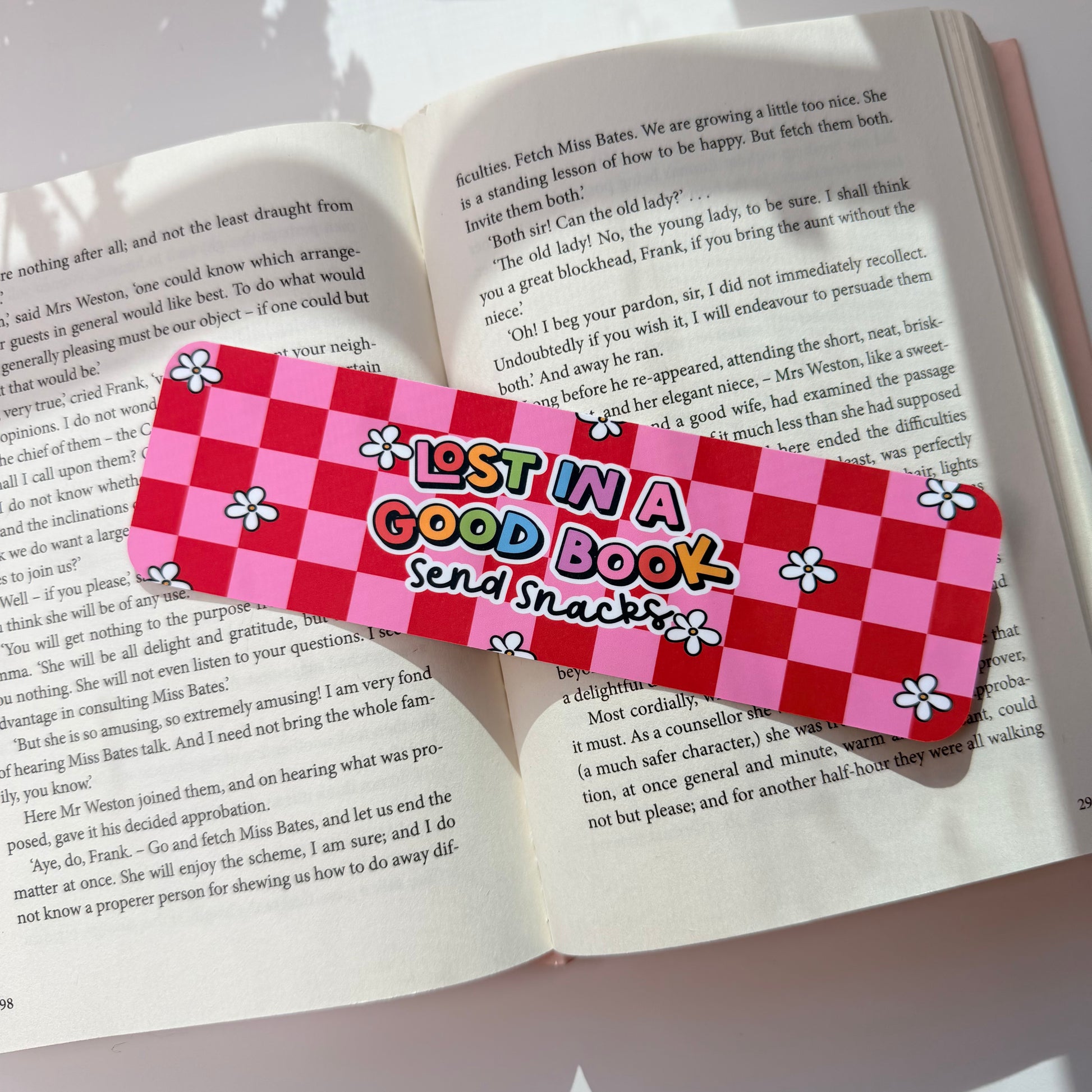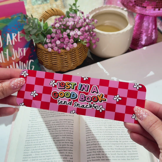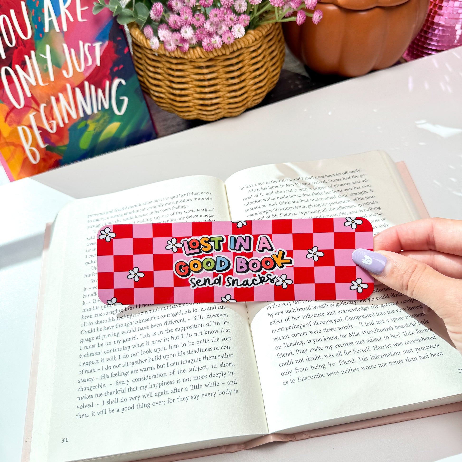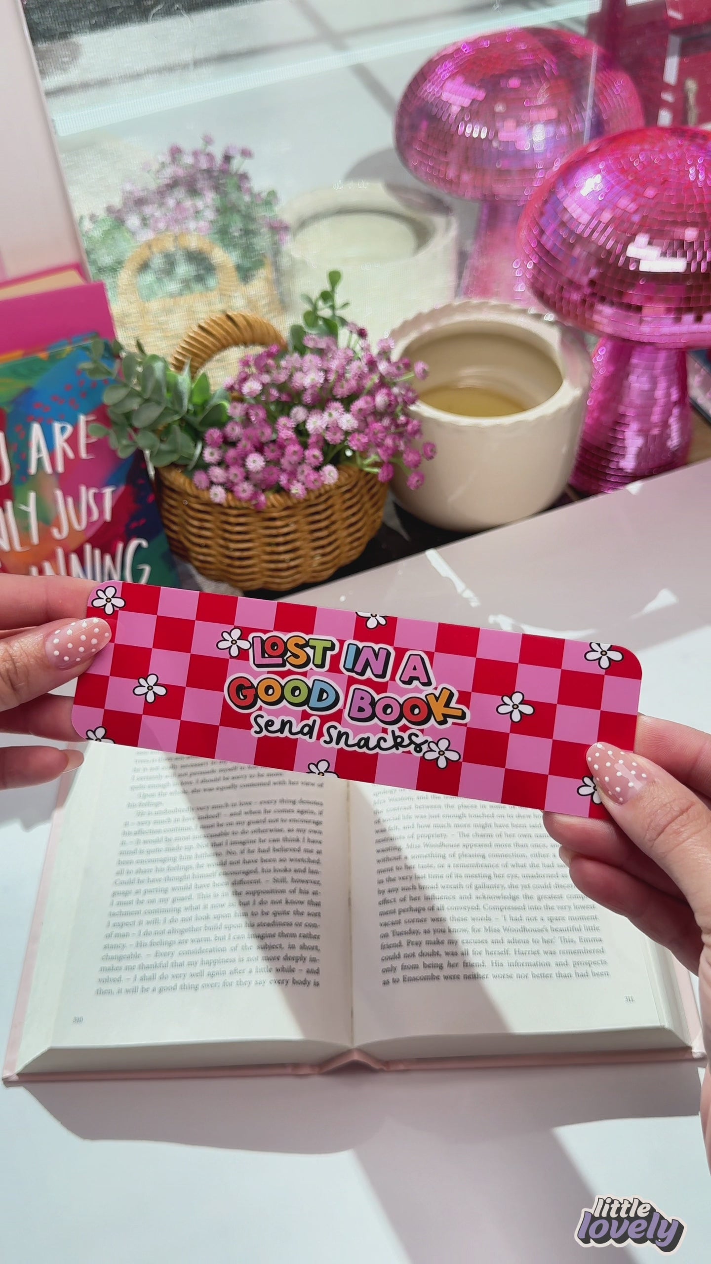 This pink checkered bookmark adds a playful touch to your reading stack — perfect for anyone who forgets time (and meals) when reading!