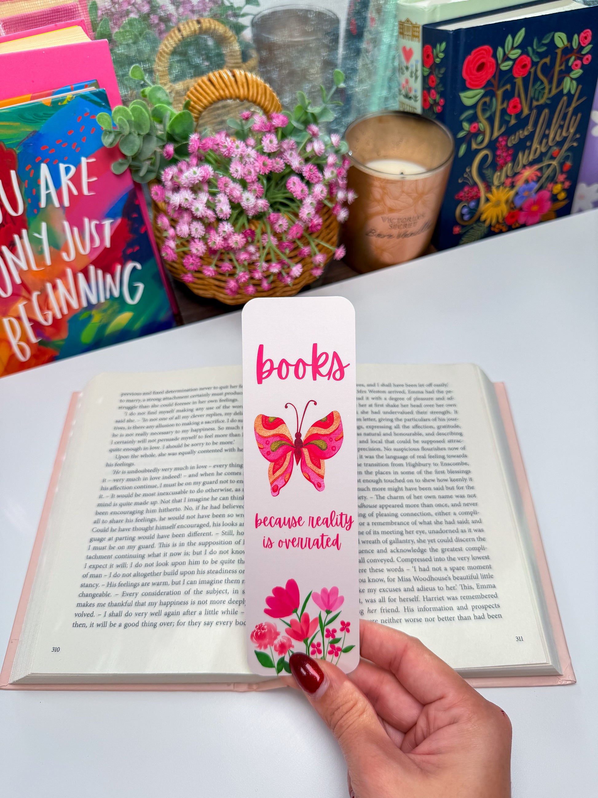This aesthetic bookmark features a dreamy butterfly and the quote “Books because reality is overrated,” making it a perfect choice for book lovers who prefer fictional worlds. A beautiful and expressive accessory for anyone who finds comfort and escape in reading…