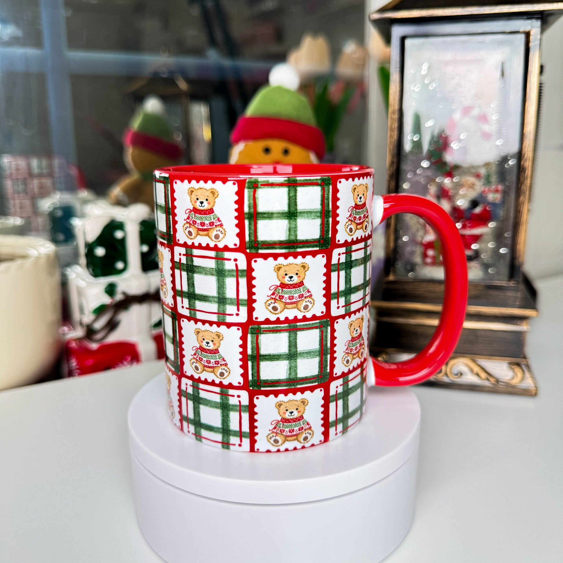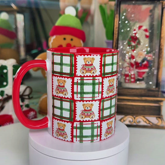 Featuring a festive pattern of cozy teddy bears and green-and-red plaid squares, this mug is perfect for bringing holiday warmth to every sip. The festive red handle and interior make it even more cheerful and seasonal.