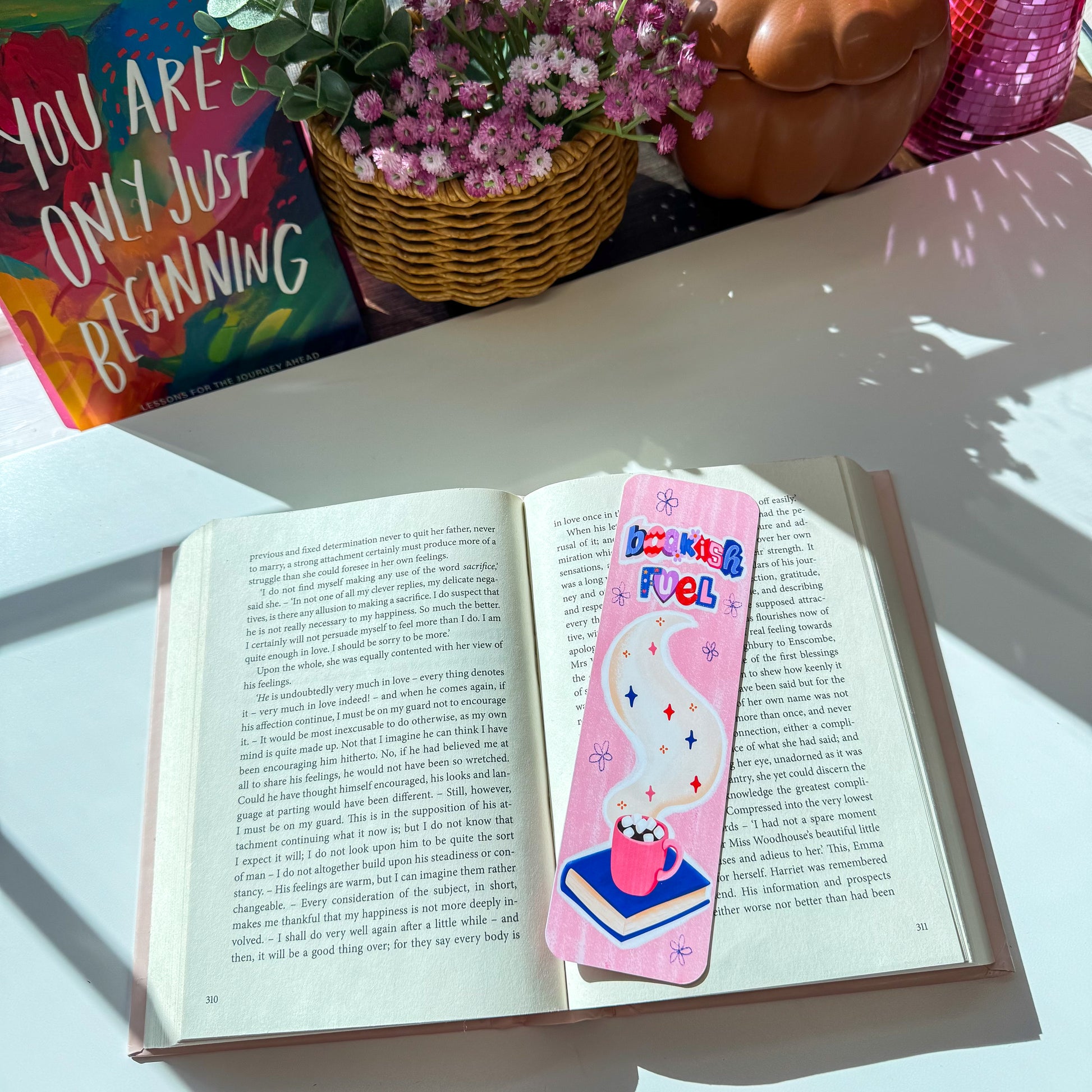 Featuring a dreamy pastel design with a steaming mug of cocoa, this pink laminated bookmark is perfect for cozy reading sessions.