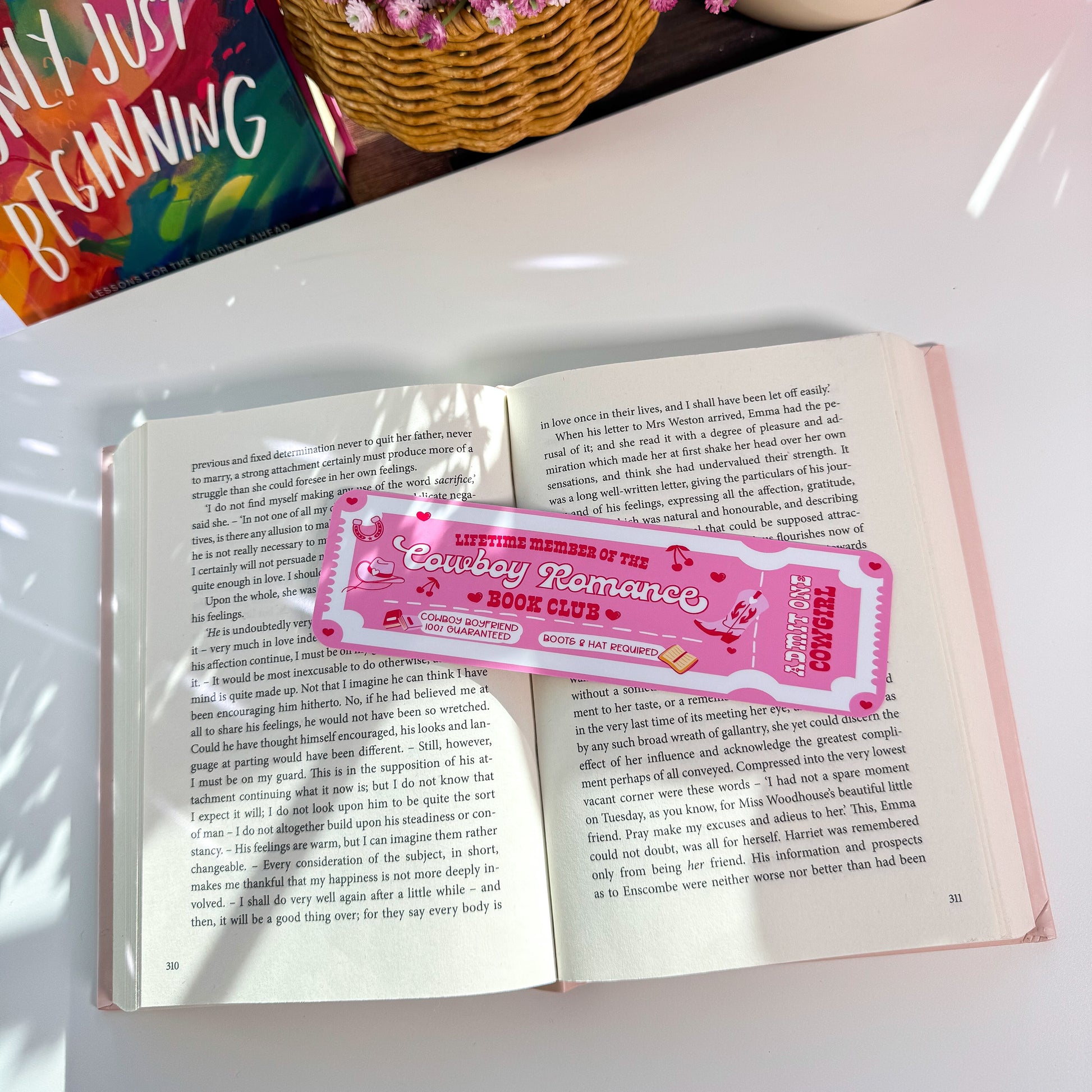 This pink western-inspired bookmark features cute cowboy icons, boots, and hearts — perfect for readers who can’t resist a little southern charm and slow-burn romance.