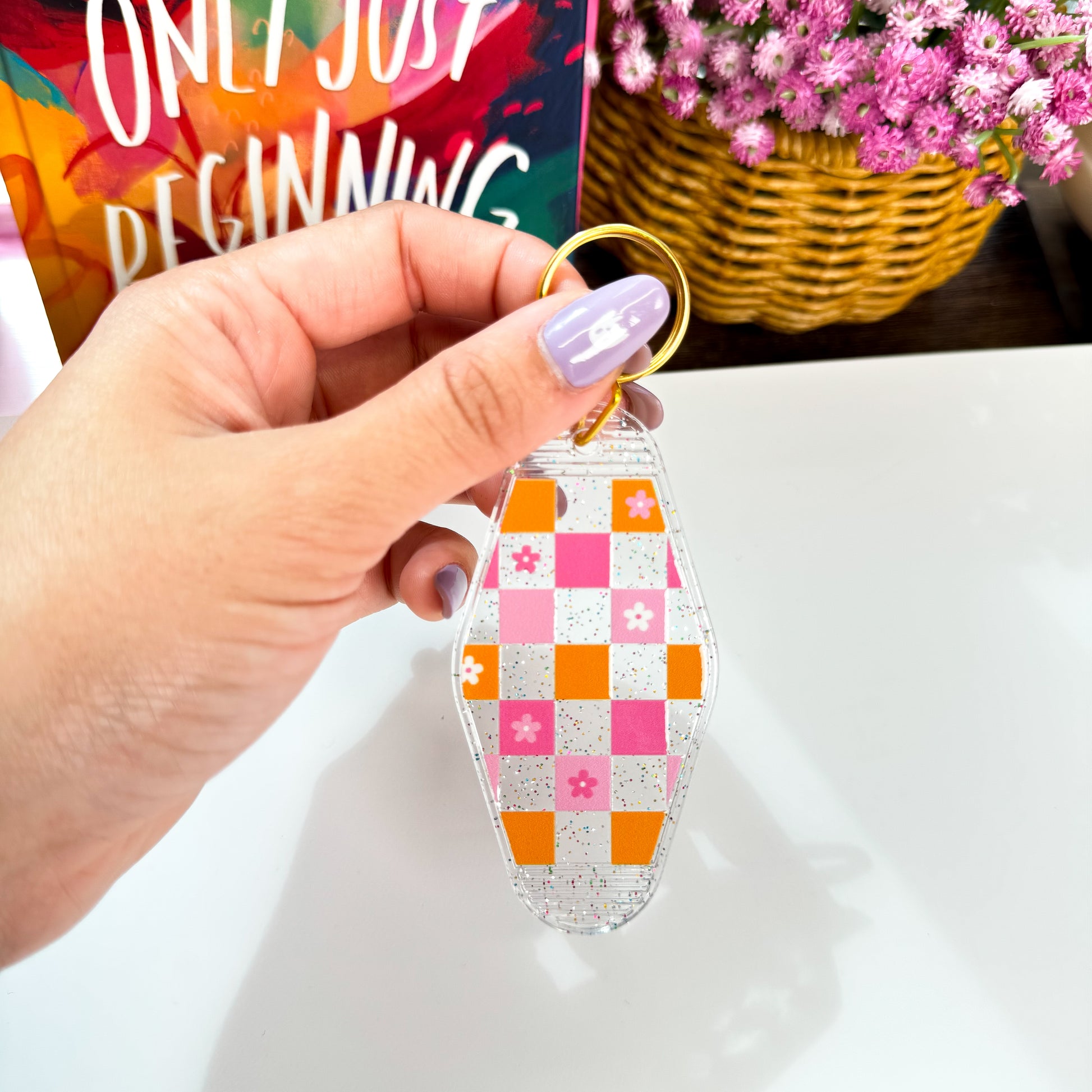 Cute Acrylic Motel Keychain – Glitter Clear with Checkerboard Flowers ✨🌸