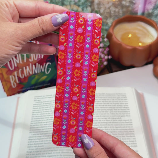 Bring bold color to your reading with this Red Floral Bookmark, decorated with vibrant flowers in a playful repeating pattern. Perfect for adding a cheerful touch to your favorite book, this laminated and handmade bookmark is made to last and keep your place in style.