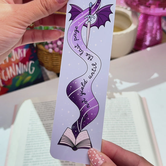 This magical bookmark features a celestial sword with dragon wings, surrounded by a swirl of stars and the quote “Do not yield until the last page.” A dreamy purple background adds the perfect touch of mystery.