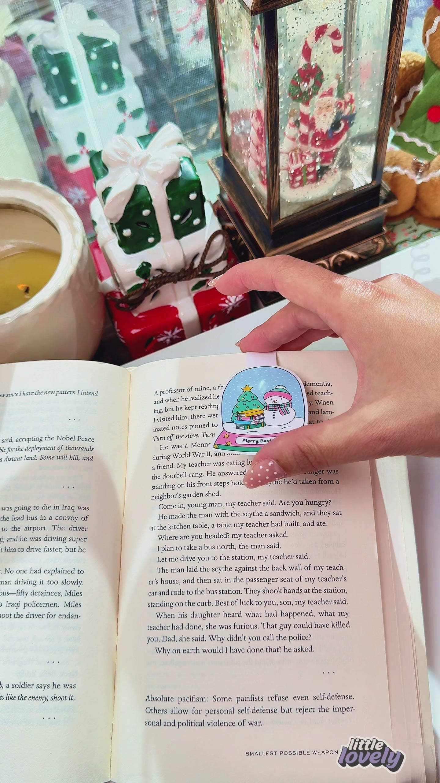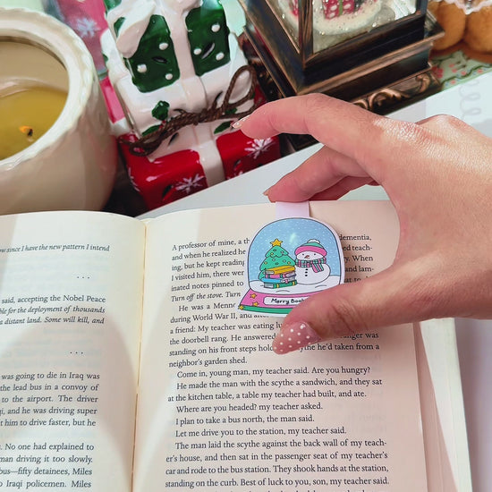 This magnetic bookmark features an adorable snowman inside a snow globe with a stack of books and a Christmas tree — perfect for bringing a little sparkle to your holiday reading.
