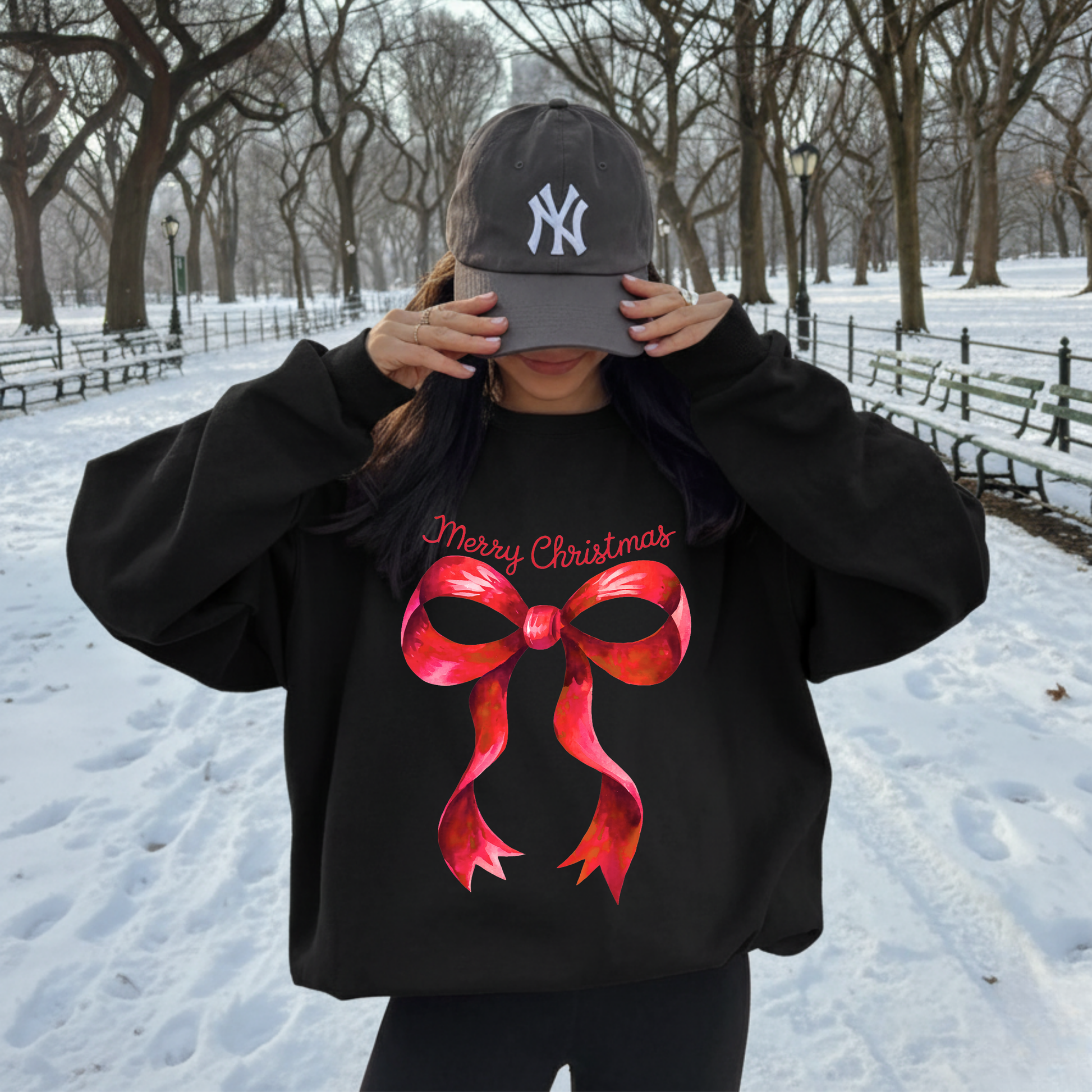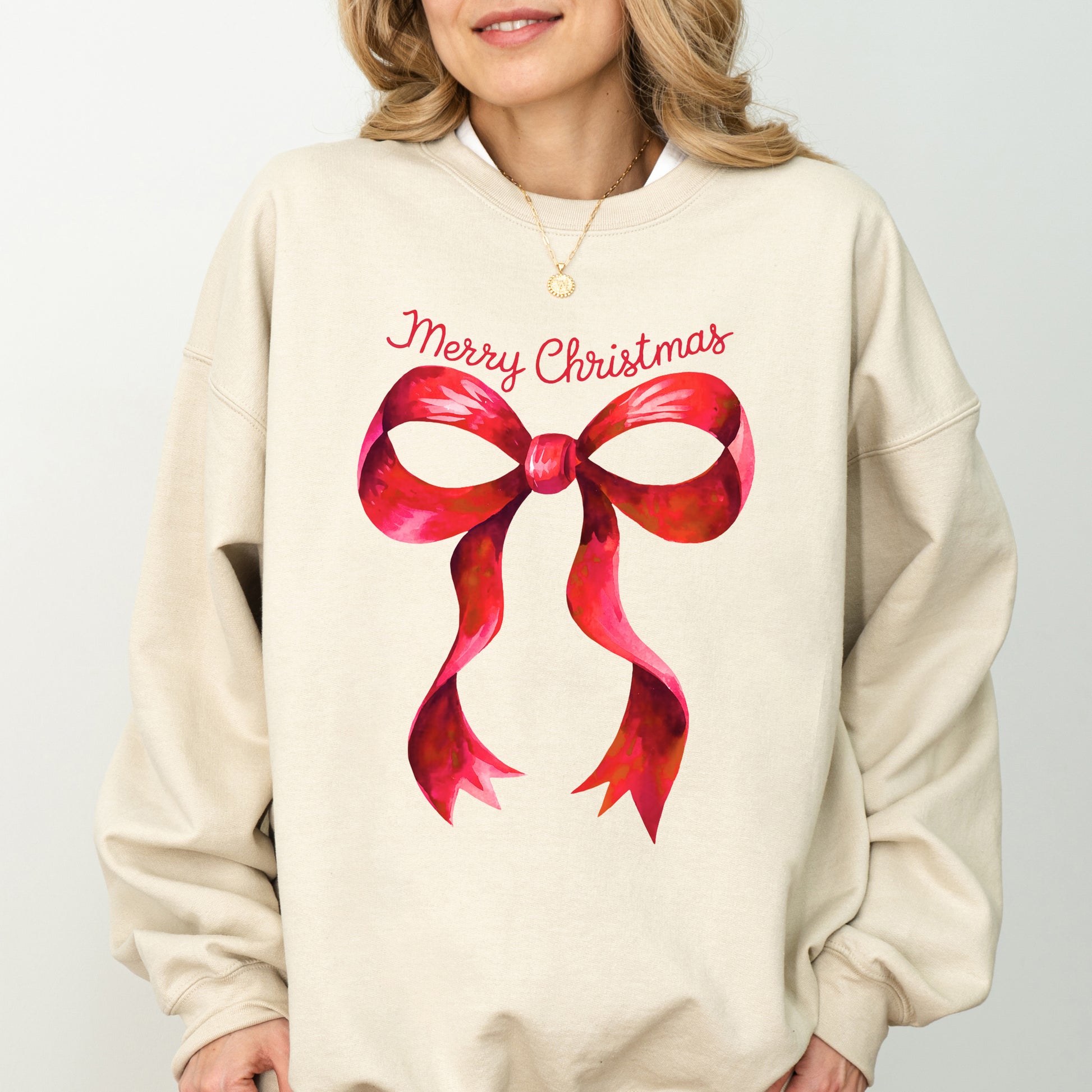 Simple, elegant, and festive — this sweater features a glossy red bow with “Merry Christmas” written in a charming script. It’s a timeless holiday design that brings a chic and cozy vibe to your winter wardrobe.