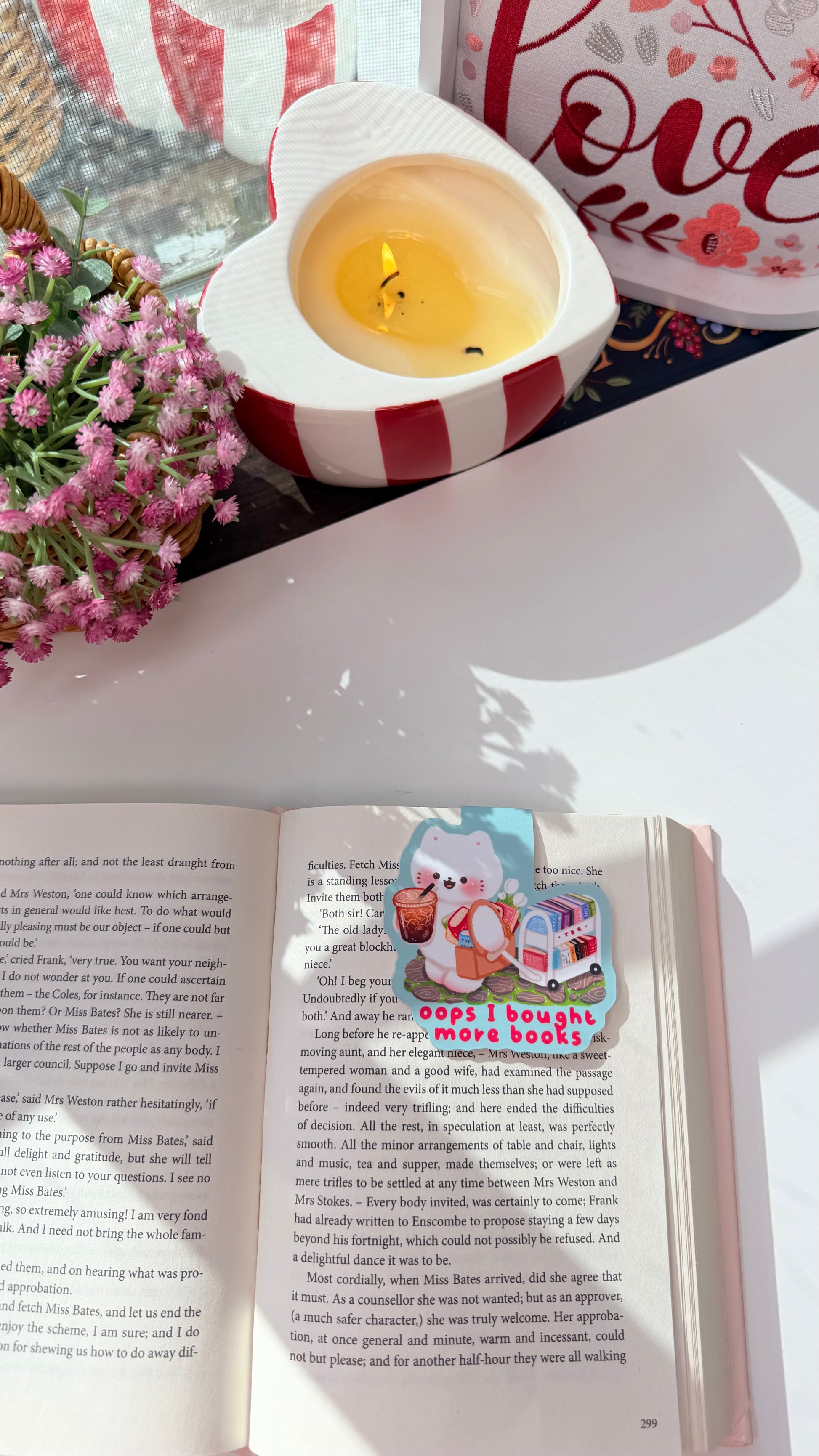 This adorable bookmark features a cute character carrying books with the relatable phrase “Oops I bought more books.” Perfect for readers who simply cannot resist adding more books to their collection. The playful illustration and soft colors make it both charming and fun to use.