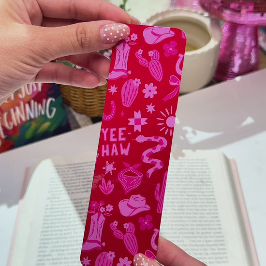 This bold pink-and-red western bookmark features boots, hats, cacti, and little stars — a fun mix of retro charm and modern bookish vibes. Perfect for readers who love a touch of sass and style with every chapter!