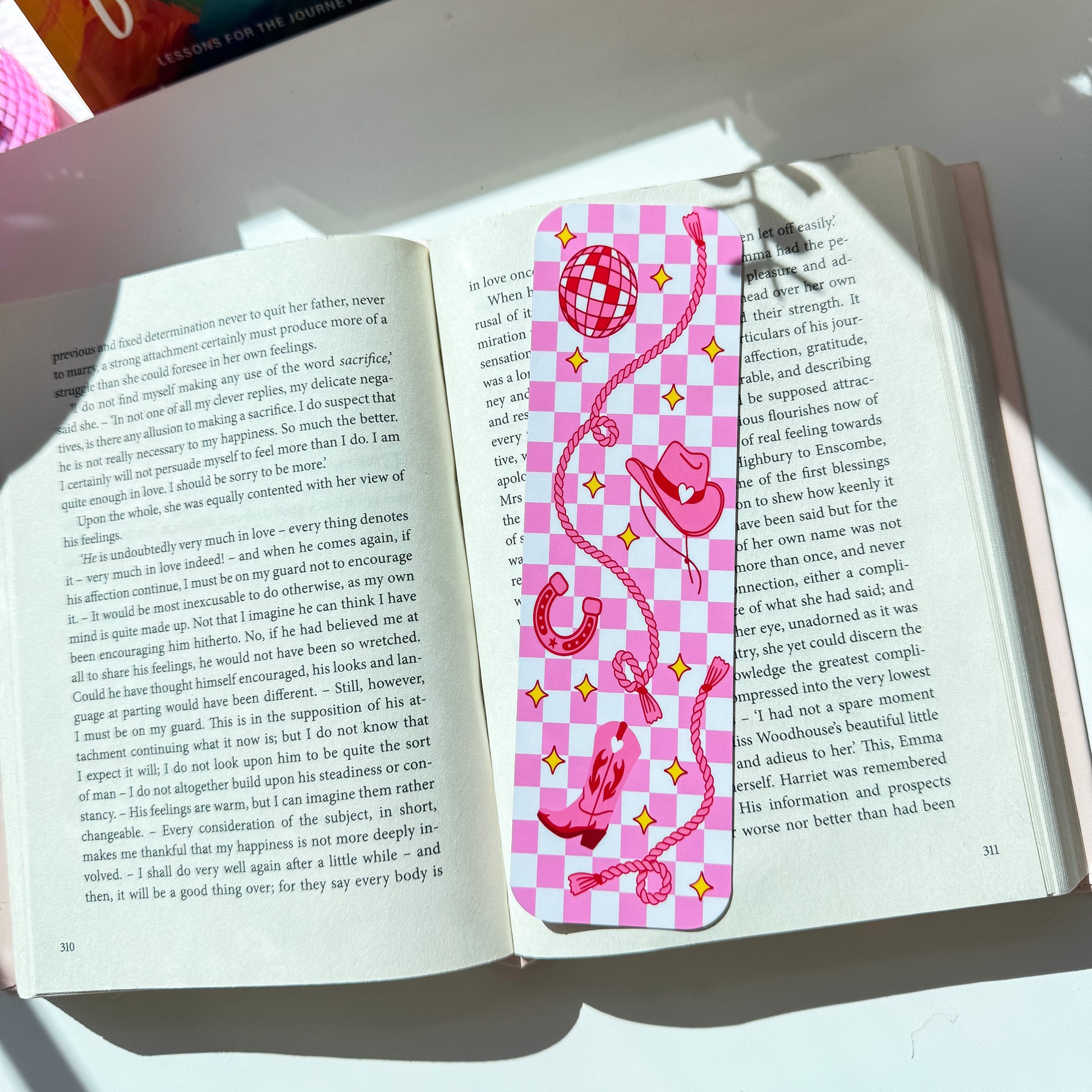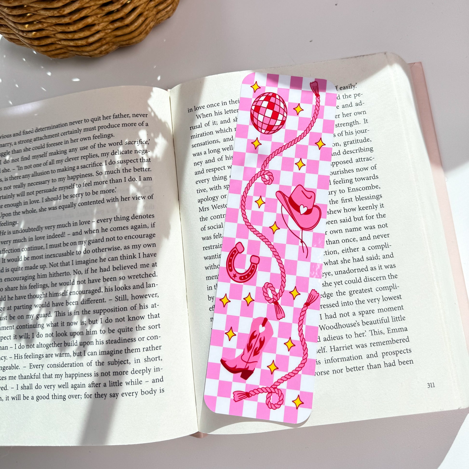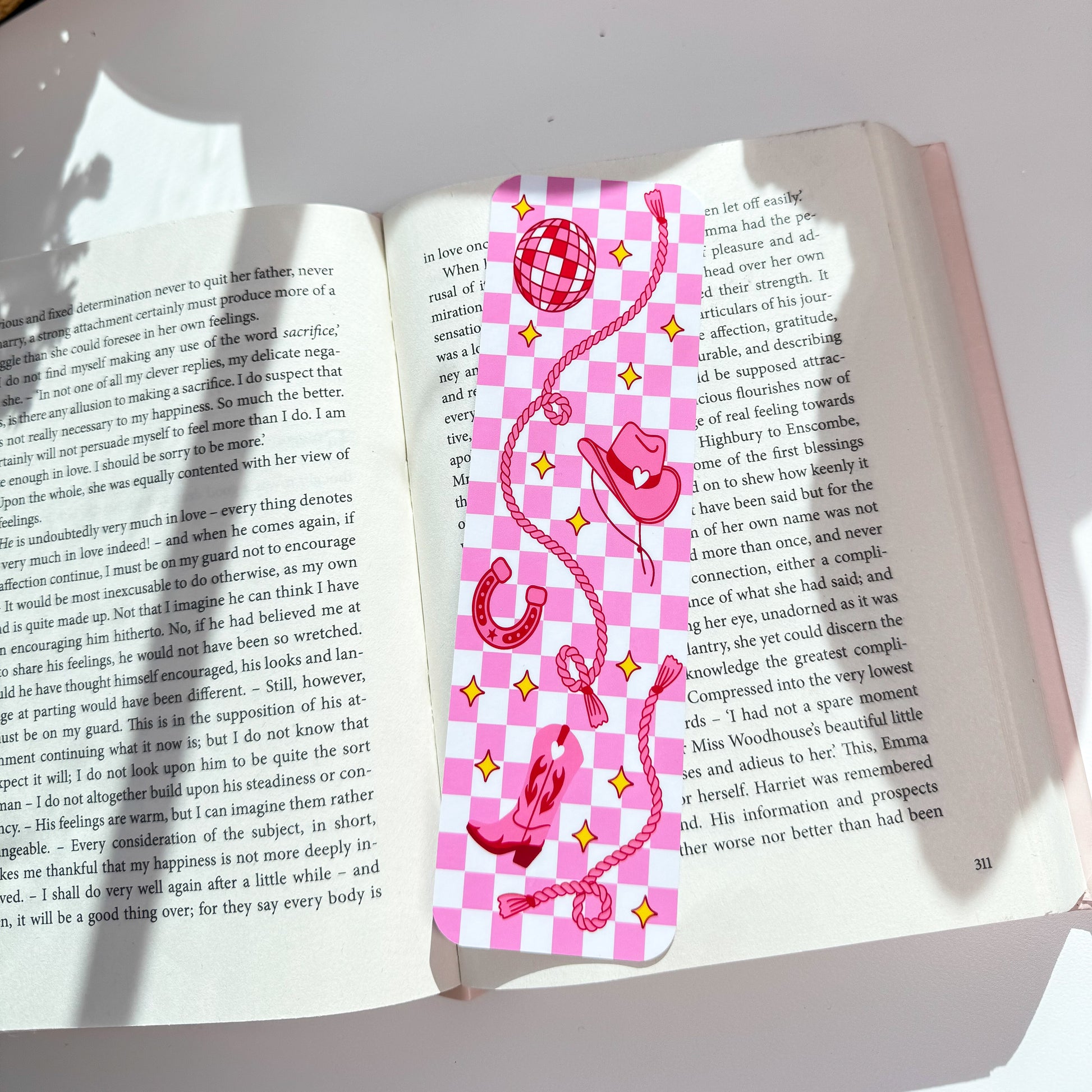 Add a little Yeehaw energy to your next reading session with this adorable Pink Western Bookmark! Featuring cowgirl boots, hats, and disco sparkles on a pink checkered background, it’s the perfect mix of western charm and girly aesthetic. Laminated, glossy, and handmade to make your reading time extra fun.
