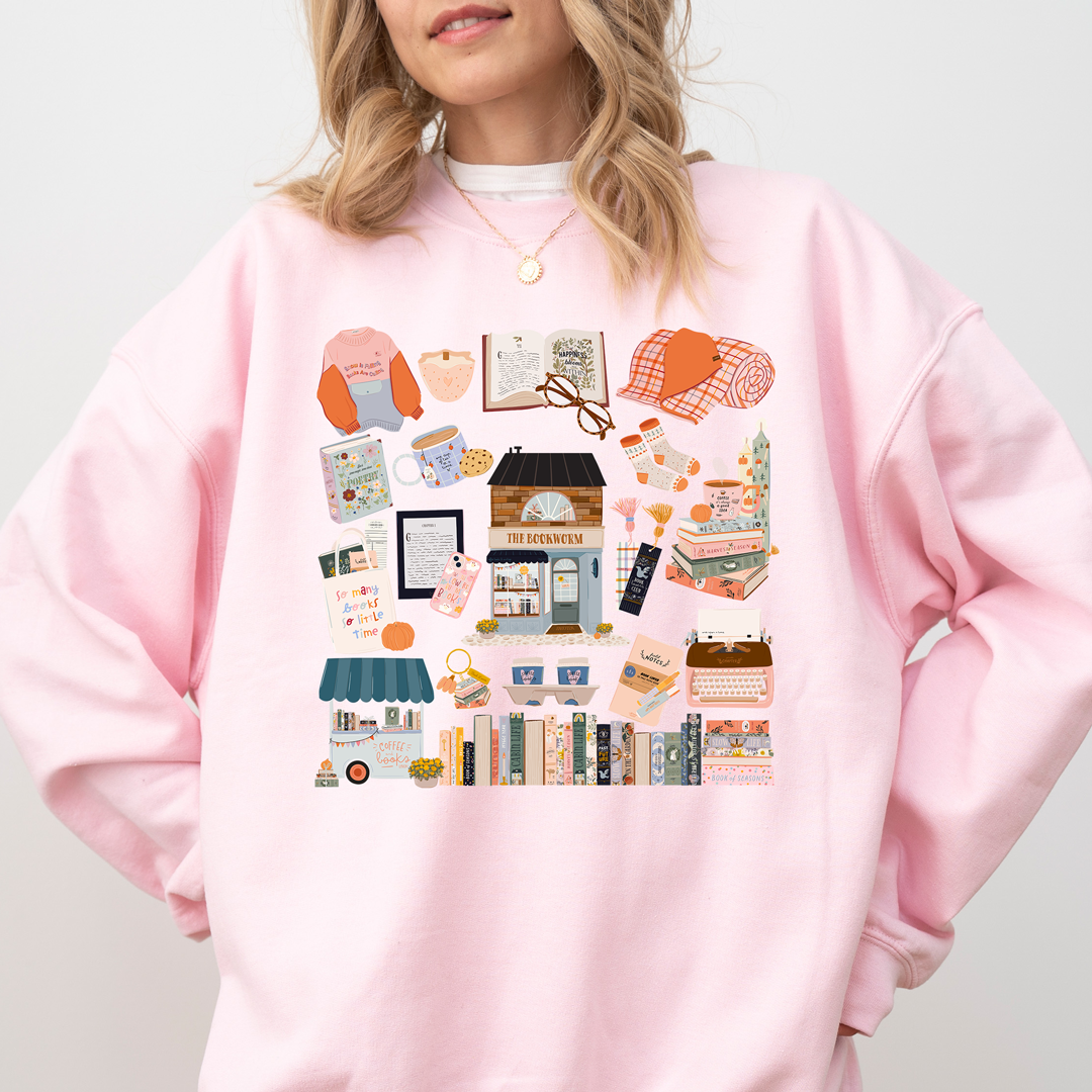 Wrap yourself in cozy bookish charm with our Bookworm Village sweatshirt — a warm and whimsical design featuring a collage of everything a true book lover adores: charming bookstores, stacks of books, cozy sweaters, coffee, cookies, and little details that bring reading days to life.