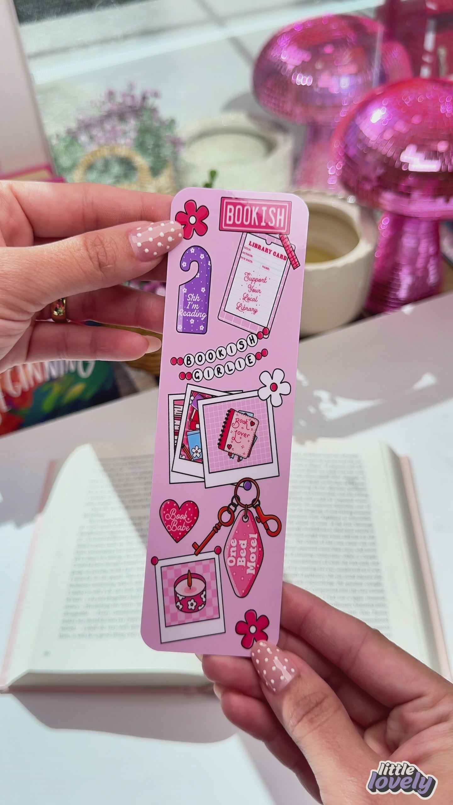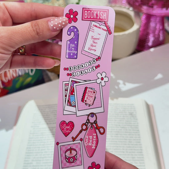 Featuring a collage of bookish charms and polaroid memories, this bookmark is the perfect accessory for your next read.