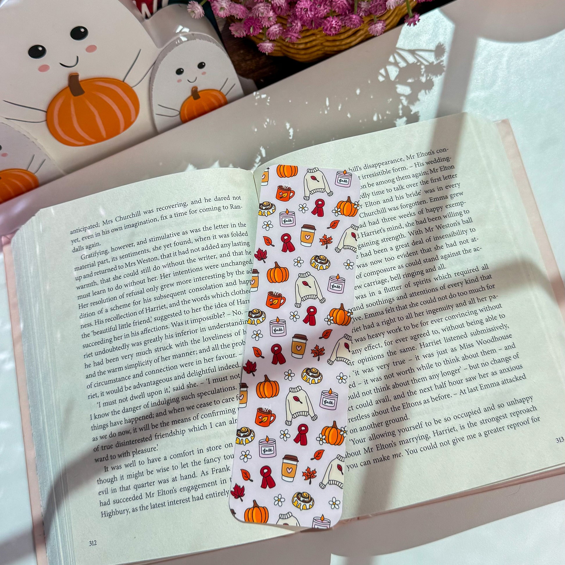 Bring cozy fall vibes to your reading time with this adorable Halloween bookmark featuring cute ghosts, pumpkins, sweaters, coffee cups, candles, and sweet treats. With a soft pastel touch and playful spooky elements, it’s the perfect seasonal accessory for book lovers who enjoy both comfort and Halloween fun.