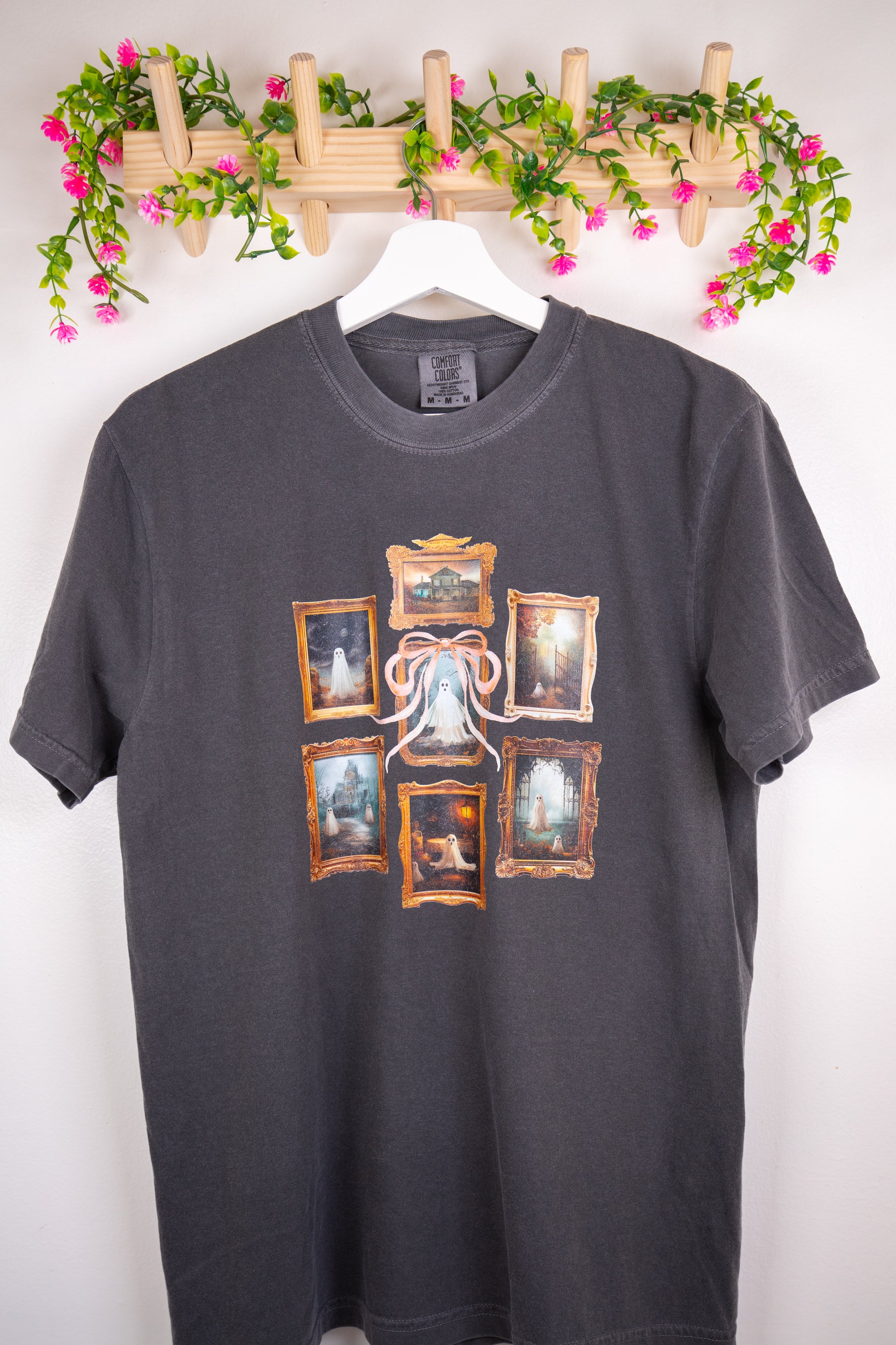 Step into the eerie elegance of Halloween with our Haunted Gallery Tee. Featuring a spooky collection of vintage-style framed portraits and ghostly art, this design gives off haunted mansion energy with a stylish twist.
